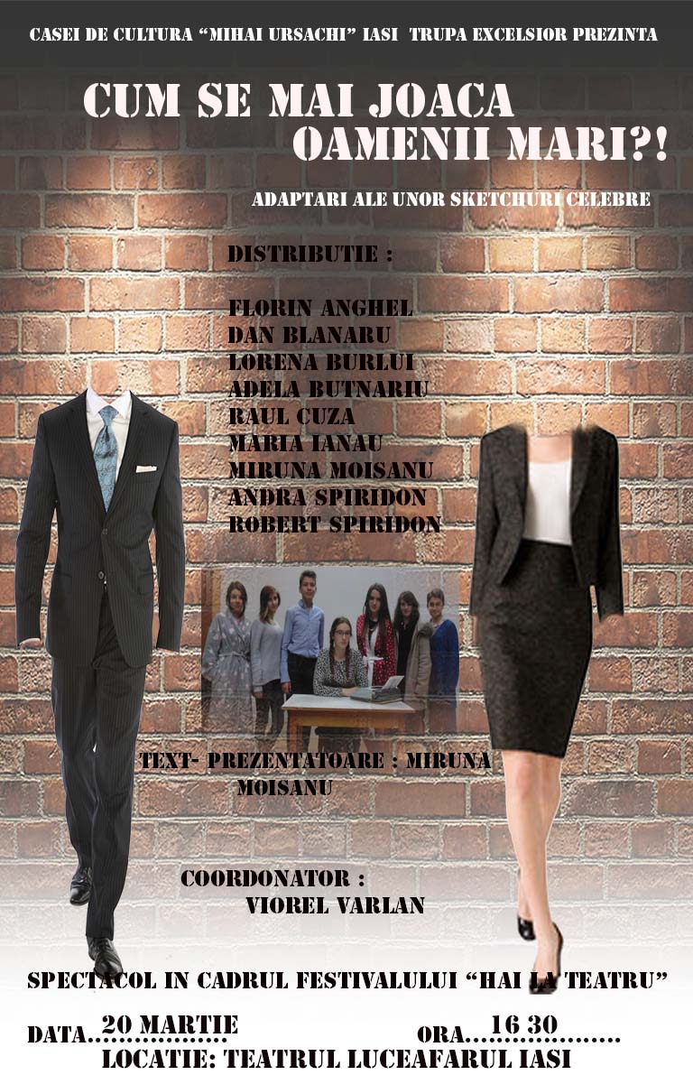 Trupa Excelsior s-a bucurat de un adevărat succes, cu piesa numită sugestiv “Cum se mai joacă oamenii mari ?!”, publicul savurând sketchurile de altădată, transpuse într-o manieră nouă. Piesa de teatru reunește mai multe sketchuri în stilul celor pe care le puteai vedea la televizor în anii 80’ – 90’, dar pune accent pe faptul că adulții uită în lumea lor să se destindă, să vadă realitatea dintr-o altă perspectivă, cea a copiilor , cea fără giji, în care deciziile sunt luate mult mai natu